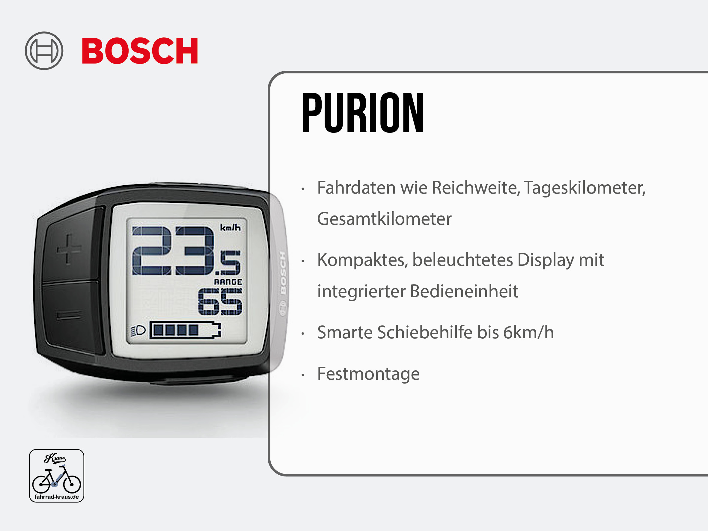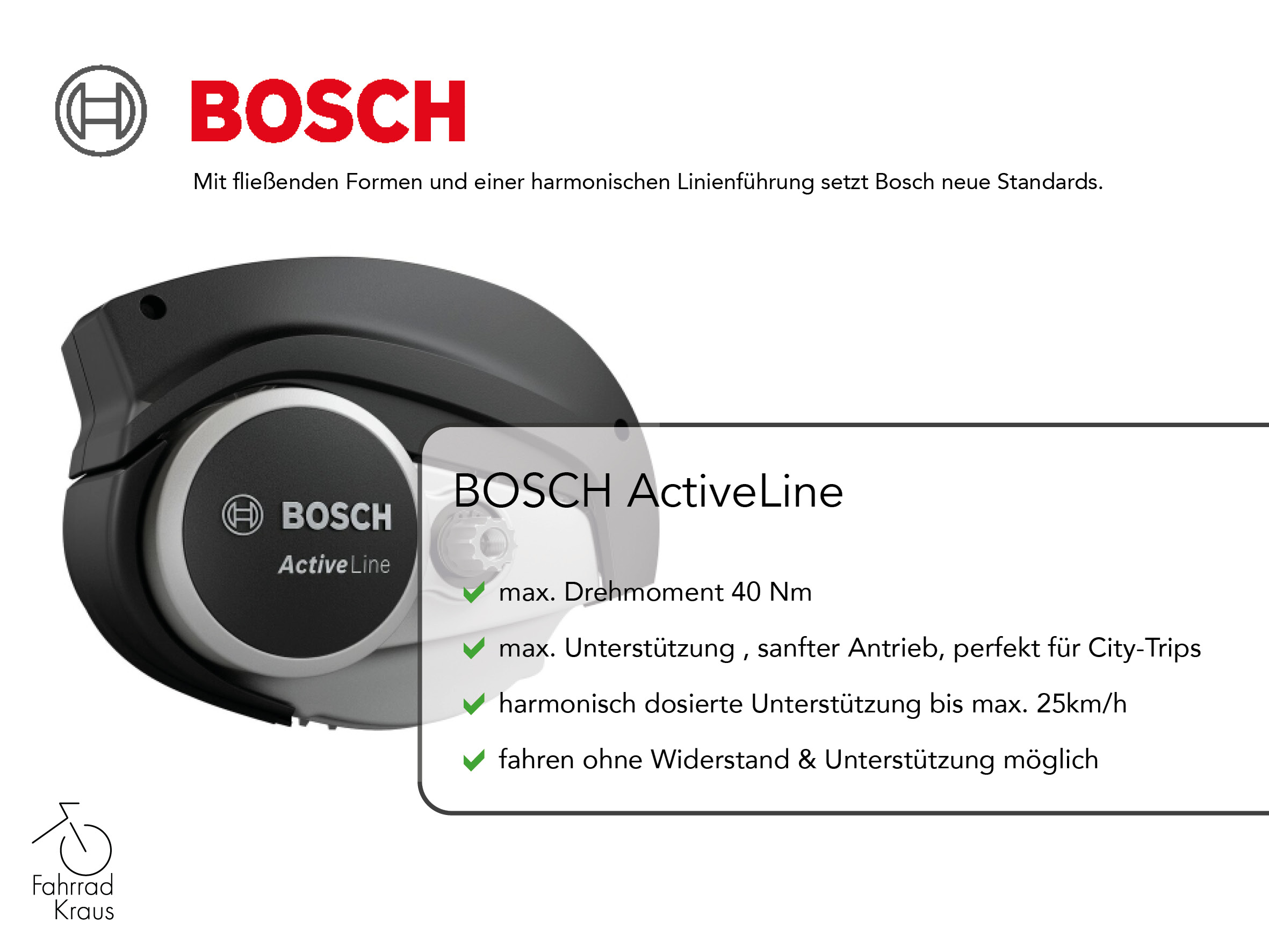 Ausgestattet mit dem leistungsstarken Bosch Active Motor mit einer Kapazität von 500 Wh und einem Drehmoment von 40 Nm ( Newtonmeter) ermöglicht das E-Bike ein müheloses Vorankommen, selbst bei anspruchsvollen Strecken. Das Bosch Purion Display ermöglicht es Ihnen, das Licht bequem ein- und auszuschalten und behält dabei stets den Überblick über Ihre Geschwindigkeit und den Akkustand.