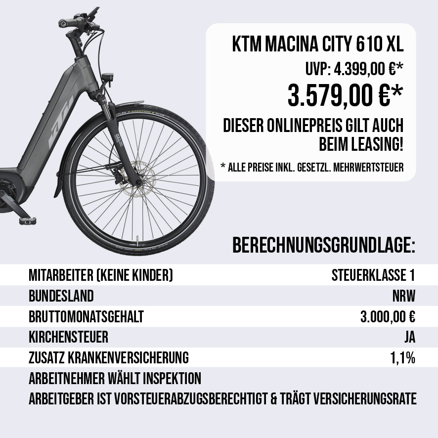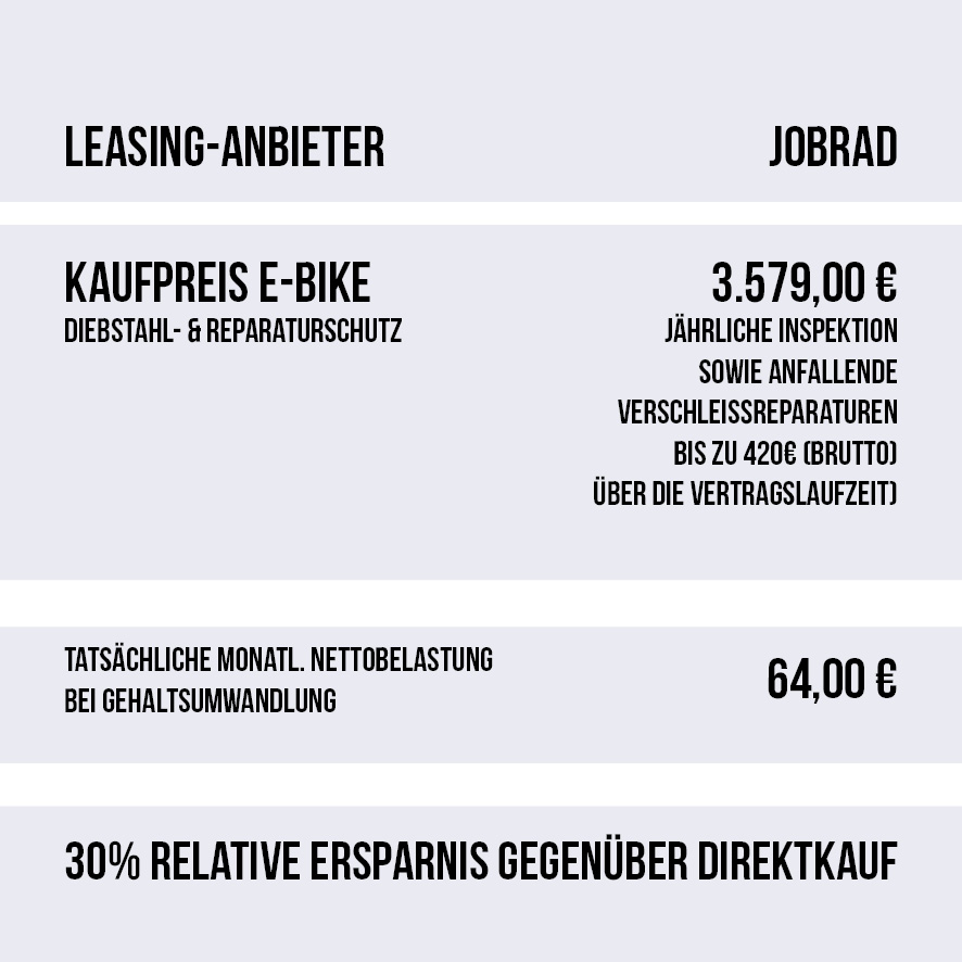 Dank unserer Partnerschaften mit führenden Anbietern wie Jobrad, Lease a Bike, Eurorad und anderen bieten wir dir die Möglichkeit, dein Traum-E-Bike unkompliziert und bequem über deine monatliche Gehaltsabrechnung zu leasen. Ein klarer Vorteil für dich: Die Leasingraten werden direkt von deinem Bruttogehalt abgezogen, sodass du von einer Steuerersparnis profitierst. Profitiere von einer günstigen 0,25 %-Besteuerung bei der Gehaltsumwandlung und spare so bis zu 40 % im Vergleich zum Direktkauf. Unsere Leasingpartner sorgen für ein sorgenfreies Fahrerlebnis und bieten dir Rundum-Schutzpakete, die bei Diebstahl, Unfällen oder Pannen schnelle Hilfe garantieren. Weiter unten findest du eine detaillierte Beispielrechnung mit Jobrad, einem unserer Leasingpartner. Deine individuelle Leasingrate kannst du mit dem passenden Rechner deiner Leasinggesellschaft schnell und unverbindlich hier berechnen. Jetzt losradeln und sparen! Berechne jetzt deine Leasingrate hier und genieße die Vorteile des Fahrradleasings mit nur ein paar Klicks.