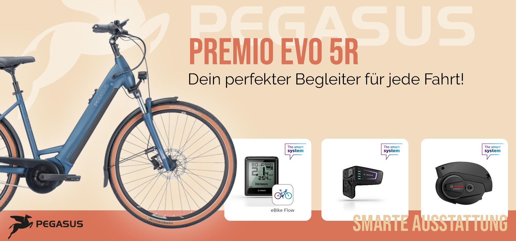 Tauche ein in die Freiheit des Radfahrens mit dem Pegasus Premio Evo 5R. Dieses E-Bike kombiniert modernste Technologie mit ansprechendem Design und macht jede Fahrt zu einem unvergesslichen Erlebnis. Ob du für den täglichen Pendelverkehr, entspannte Wochenendausflüge oder herausfordernde Touren in der Natur unterwegs bist – das Premio Evo 5R ist für jede Situation optimal gerüstet.